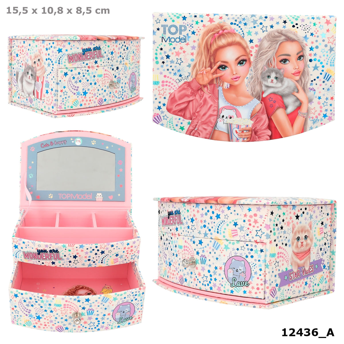 Det fine, lille smykkeskrin fra TOPModel Cutie Star er dekoreret med superfine stjerner, muntre popcornmotiver, søde killinger og et flot modelmotiv af Candy og Christy. Smykkeskrinet har et spejl i låget, flere separate rum øverst og nederst en stor skuffe med en glitrende sten på knoppen.