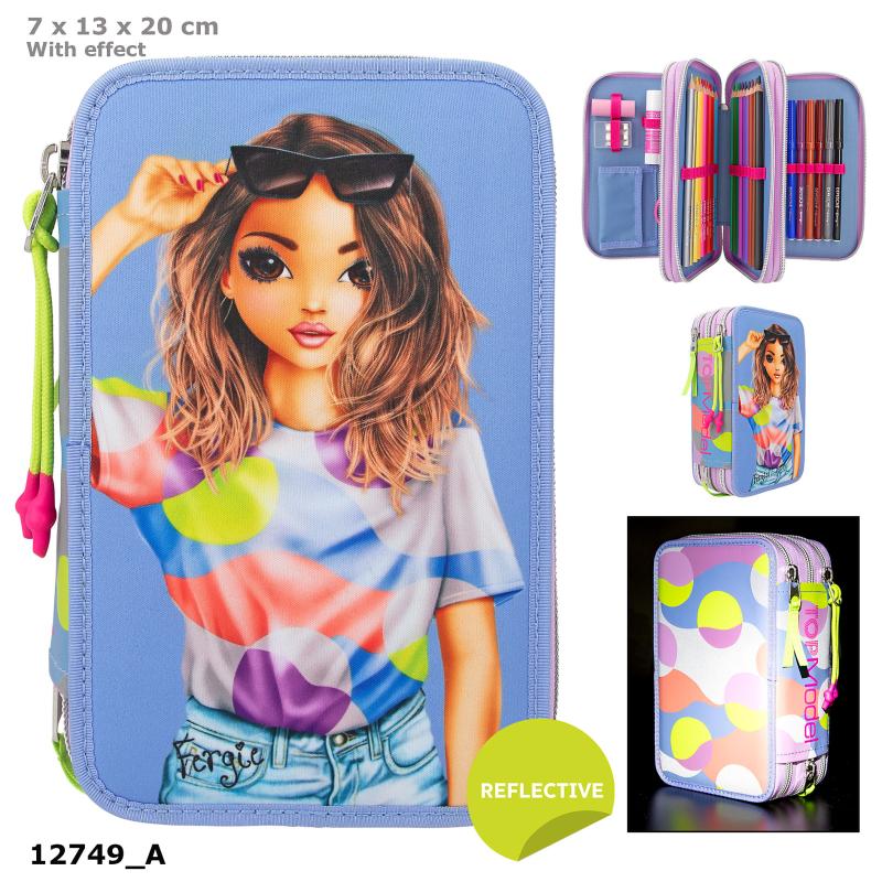 Alle de skrive- og tegneredskaber, du har brug for i skolen og derhjemme er praktisk samlet i dette rummelige 3-fløjede penalhus fra TOPModel FLASH- serien. Penalhuset er i flot lyslilla med farverigt, grafisk mønster i reflekterende materiale på bagsiden og siderne, motiv af TOPModel Fergie på fronten samt mange neonfarvede detaljer. Penalhuset er desuden opdelt i tre rum og fyldt med alt, hvad man skal bruge til at tegne og skrive med i skolen og derhjemme. Indeholder bl.a. saks, lineal, viskelæder, blyantspidser, 2 blyanter, 18 farveblyanter og 18 tuscher og meget mere.