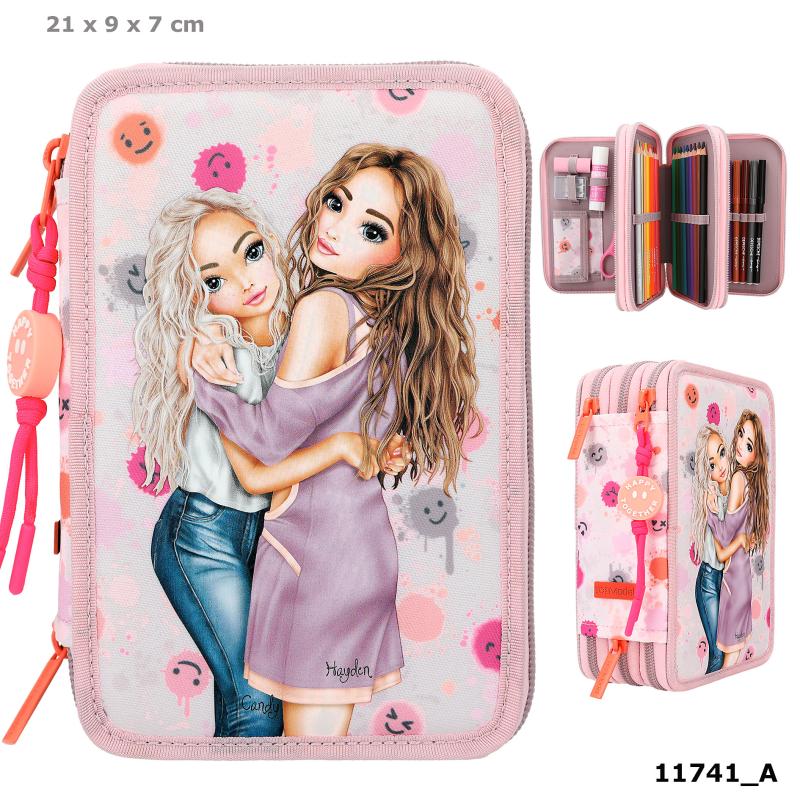 Et virkelig fint penalhus i sart rosa og lilla mixet med detaljer i stærk pink og orange fra TOPModel HAPPY TOGETHER serien, som med det fine design og glade emojies er med til at sprede godt humør. Penalhuset er opdelt i tre rum og fyldt med alt, hvad man skal bruge til at tegne og skrive med i skolen og derhjemme. Indeholder bl.a. saks, lineal, viskelæder, blyantspidser, 2 blyanter, 18 farveblyanter og 18 tuscher, sejt lynlåsvedhæng og meget mere.