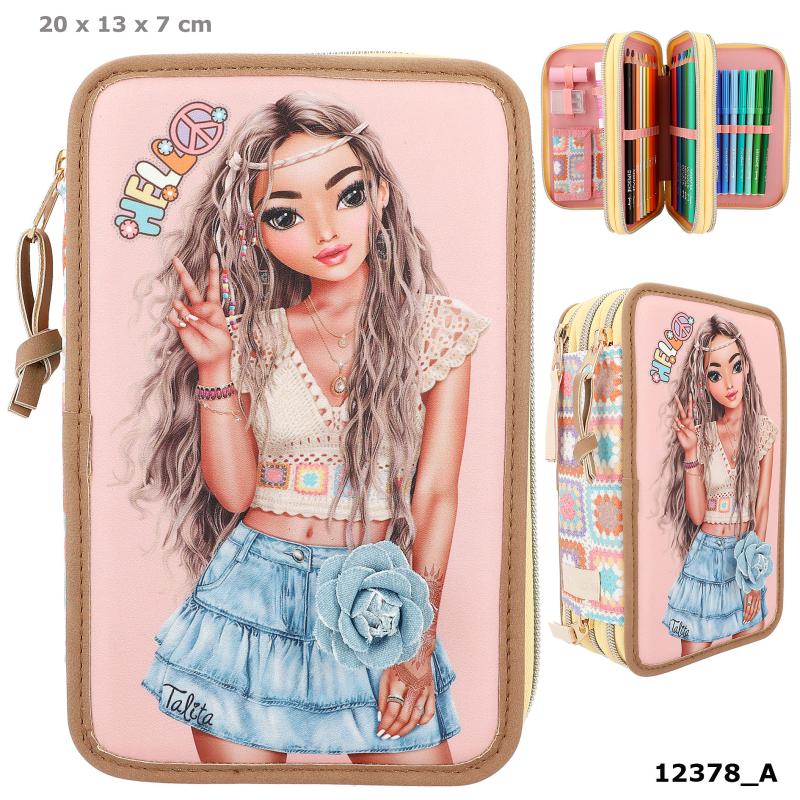 Flot og praktisk penalhus fra TOPModel. Penalhuset er opdelt i tre rum og fyldt med alt, hvad man skal bruge til at tegne og skrive med i skolen og derhjemme. Indeholder bl.a. saks, lineal, viskelæder, blyantspidser, to blyanter, 18 farveblyanter og 18 tuscher og meget mere.