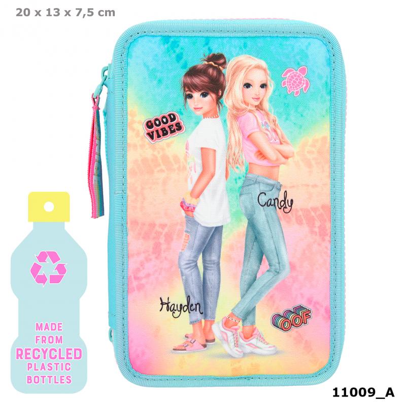 Flot og praktisk penalhus fra TOPModel. Penalhuset er opdelt i tre rum og fyldt med alt, hvad man skal bruge til at tegne og skrive med i skolen og derhjemme. Indeholder bl.a. saks, lineal, viskelæder, blyantspidser, to blyanter, 18 farveblyanter og 18 tuscher og meget mere. Der er brugt genbrugsflasker til at producere dette produkt.