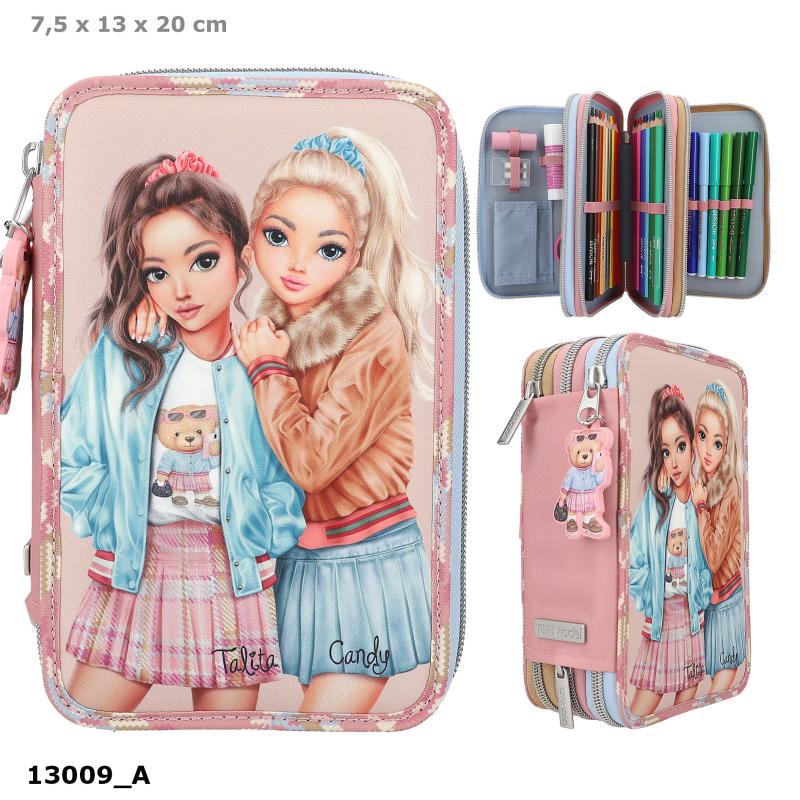 Dette fine trippel penalhus fra TOPModel Team Teddy serien er i flot, støvet rosa med lyseblå og ternede detaljer, motiv af modellerne Candy og Talita og med den sødeste teddydbjørn som lynlåsvedhæng. Trippelpenalhuset indeholder tre store rum, der er fyldt med alt, hvad man skal bruge til at tegne og skrive med både i skolen og derhjemme som bl.a. saks, lineal, viskelæder, blyantspidser, 2 blyanter, 18 farveblyanter og - tuscher.