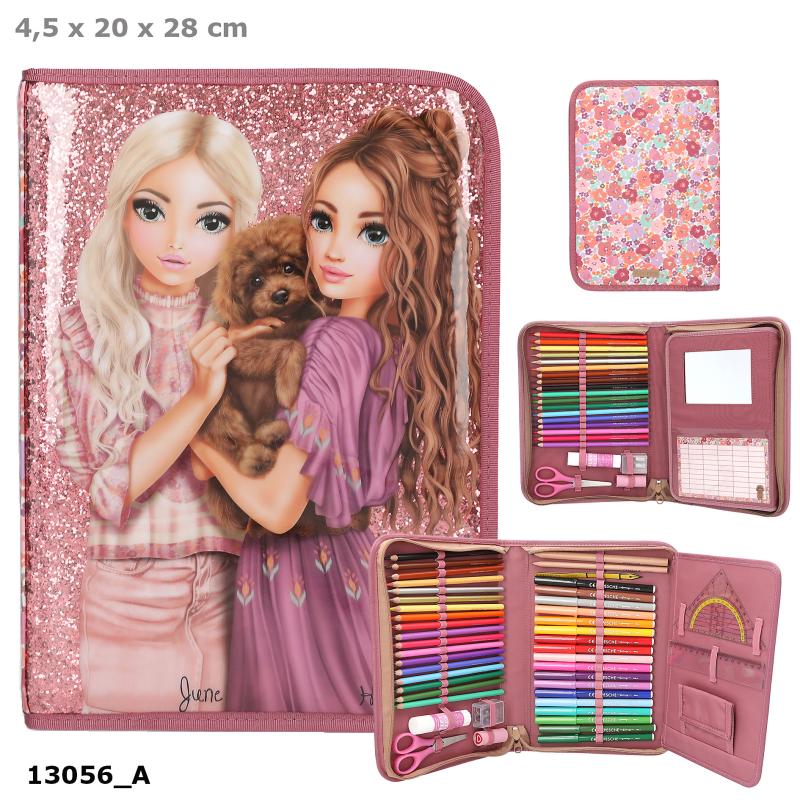 Det megastore og imponerende XXL penalhus fra TOPModel FLORAL-serien har et flot motiv af modellerne June og Hauden med den sødeste hund og på glitrende, metallisk baggrund på forsiden og et yndigt blomstermotiv på bagsiden. Indeni er der masser af plads med godt overblik over skriveredskaberne. Penalhuset indeholder blyantspidser, viskelæder, saks, lim, 2 linealer, 2 blyanter samt 18 farveblyanter og -tuscher udeover en lille påsat pung med velkrolukning, skoleskema samt spejl. Mål: 20 x 28 x 4,5 cm.
