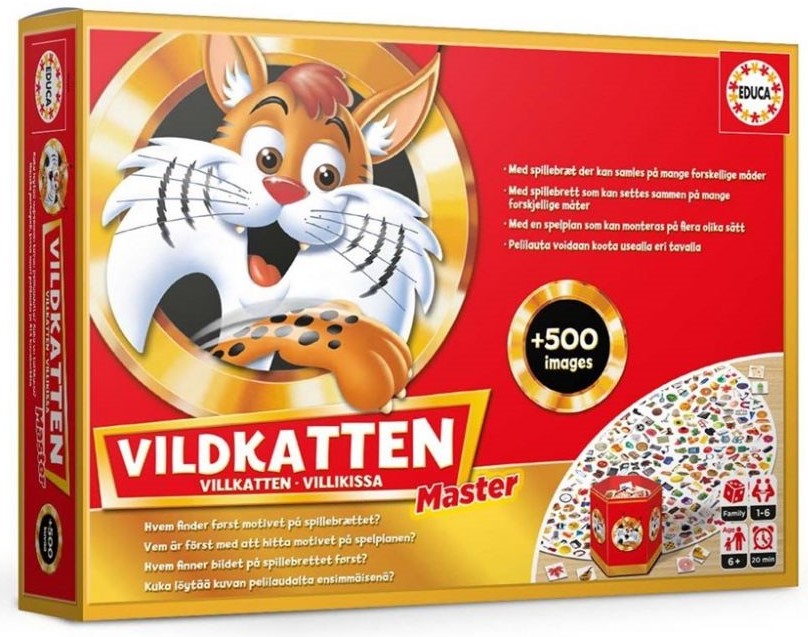 Vildkatten Master, er en udvidet udgave af det populære spil med hele 513 billedkort. Vildkatten er super nemt at lære, men du skal være på dupperne for at vinde spillet. Det kræver overblik, koncentration og iagttagelsesevne. En fantastisk sidegevinst er, at dit barns ordforråd udvides, og sammen kan I snakke om de mange, mange ting på brættet. Spilletid: 20 min. Antal deltagere: 1-6. Fra 6 år