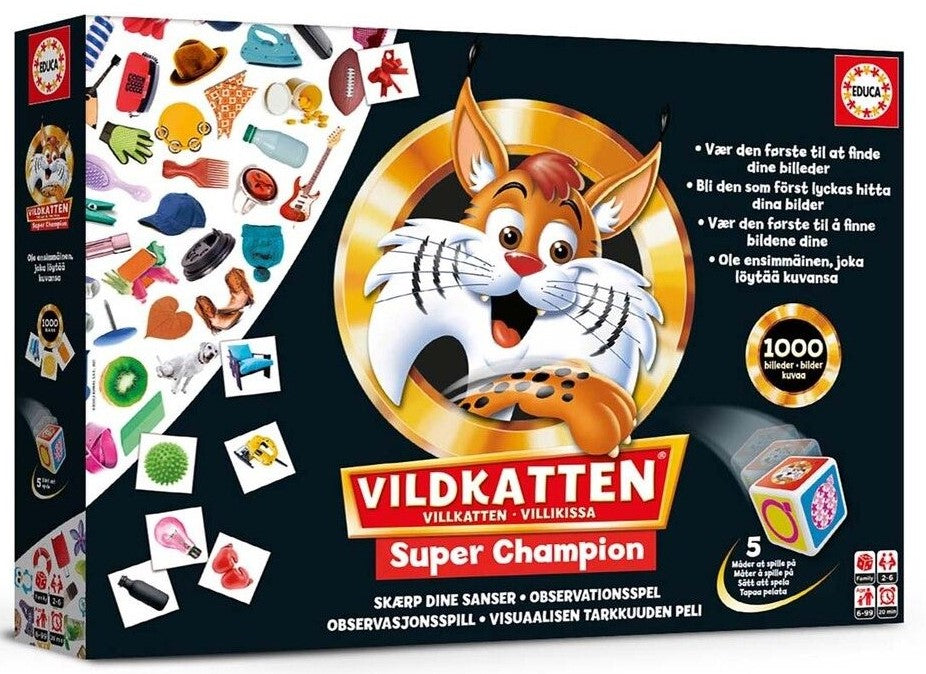 Vær den første til at få 15 billedkort ved at finde motiverne på brættet og vind spillet. Efter tur kaster en spiller terningerne og udfører en handling afhængigt af resultatet. Endnu mere udfordrende og sjovt! Vildkatten Super Champion 1000 har mere end 1000 billeder og et ombyggeligt spillebræt. Fra 11 år.
