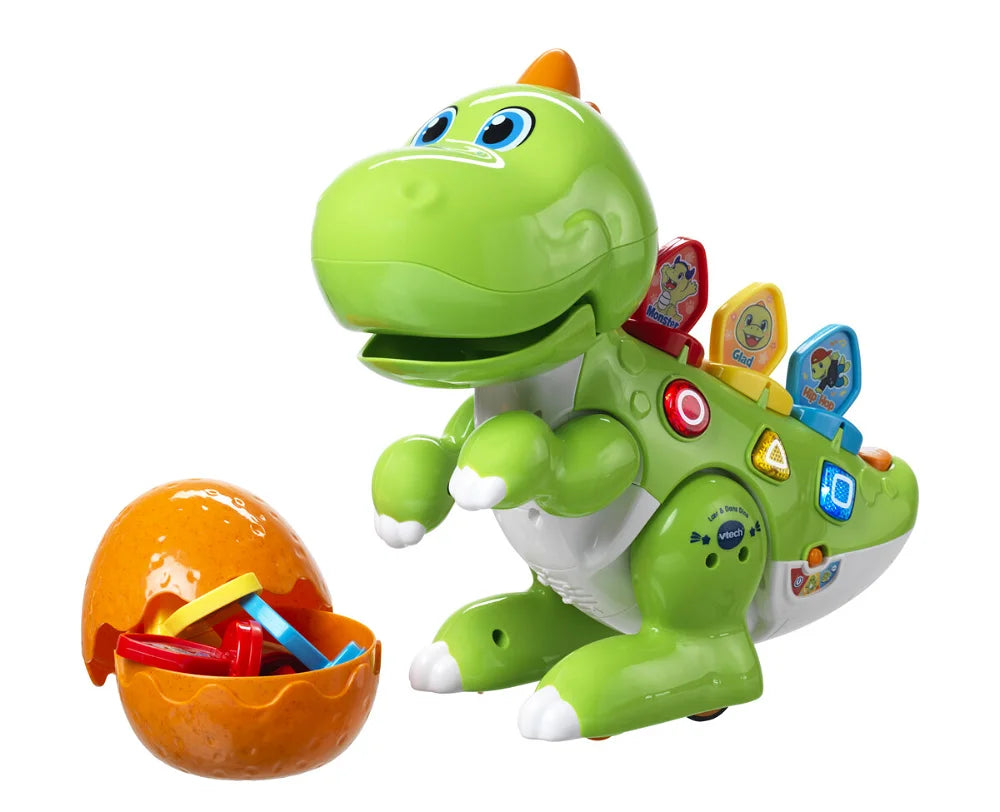 Med dansk tale. Med Vtechs Dino er det muligt at både sammensætte stemmen, humøret og hvilken dans Dino skal danse. Dinos stemme kan være som en dinosaurus, robot eller et monster. Ligesom humøret kan variere fra glad til sur og søvnig. Det samme gælder for Dinos dansetrin, som kan variere fra ballet til hiphop. Der medfølger 9 aktivitetsplader, som fastsættes Dino's ryg, for at kombinere hans humor, stemme og dans. Der er i alt 27 forskellige kombinationer. Dino spiller melodier siger lyde og synger sange, som barnet kan synge med på. Der medfølger et Dino-æg, som kan bruges til opbevaring af aktivitetspladerne. Fra 24 mdr. Batterier (4xLR6-AA). inkl