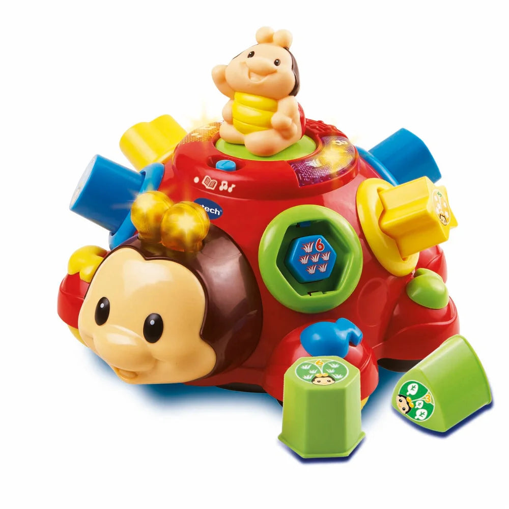 Med dansk tale. Interaktivt trækdyr fra VTech med masser af sjov og overraskelser. Læreinsektet med de skøre ben afspiller lyde og sætninger, som lærer barnet om farver, former og tal. Klodserne kan barnet sortere og putte i de matchende huller i mariehønens skjold. Legen fremmer barnets finmotorik, genkendelsesevne og logiske sans. Pres ned på baby mariehønen og se alle klodserne poppe ud af deres huller. Tryk på musikknappen og hør mere end 50 syng-med sange, musik, lydeffekter og sjove sætninger. Fra 12 mdr. Batterier (2xLR6-AA). inkl