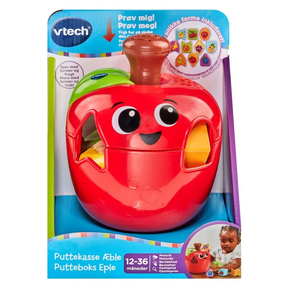 Lad os spinne og sortere med Vtech® Sjov med Sortering Æble. Et nyt spin på at sortere former! Dette søde, store formsorteringsæble er fremstillet af 90 % genvundet plast og drejer rundt ved et tryk på stilken for at skabe både klassiske former og mere unikke former – gå skridtet videre end former som firkant, diamant, oval og sløjfe! Leveres komplet med 10 klodser i forskellige former med 2 niveauer af læring: Niveau 1- 4 klassiske former eller niveau 2- 6 særlige former. Lærer også børn om 10 forskellige frugter. Motiverer og forbedrer hånd-øje-koordination, rumlig forståelse, logisk tænkning & opdagelse og udforskning.