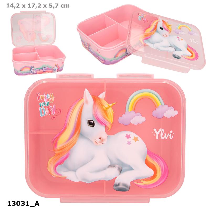Fin og super praktisk madkasse i flot lyserød med skønne enhjørning motiver fra Ylvi. Madkassen har tre separate rum samt transparent låg med smart clipslukning, der er nem at åbne og lukke. Opvask i hånden anbefales pga. print. Ikke egnet til mikroovn.