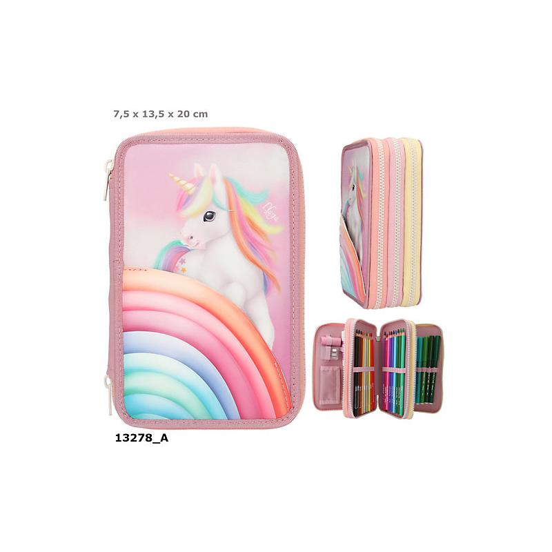 Sødt og praktisk penalhus fra Ylvi med motiv af enhjørningen Naya på forsiden bag en applikeret lomme formet som en regnbuesky i sukkersøde pastelfarver. Penalhuset er opdelt i tre rum og fyldt med alt, hvad man skal bruge til at tegne og skrive med i skolen og derhjemme: 2 blyanter, 1 saks, 1 lineal, 1 viskelæder, 1 blyantspidser, 18 farveblyanter og 18 tuscher samt en lille pung med velcro